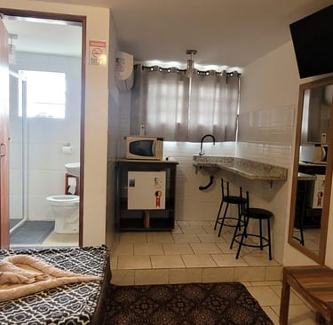Ideal para quem viaja a trabalho, com espaço para descanso e uma mesa para organizar tarefas.